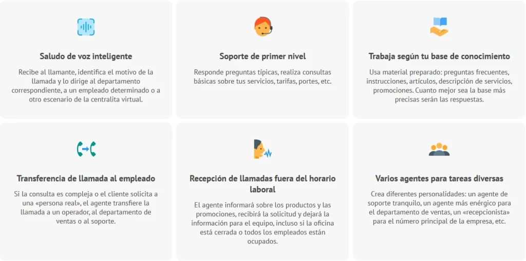 Funciones principales del agente con IA. El agente de voz con IA de Nubecall automatiza la atención de llamadas y reduce la carga de trabajo de tu equipo.